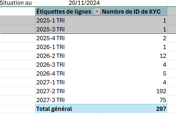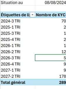 -la colonne "renouvellement des KYC" selon la date prévisionnelle de révision du KYC à l'onboarding ou lors du renouvellement du KYC (données alimentées lors du Processus RUN)