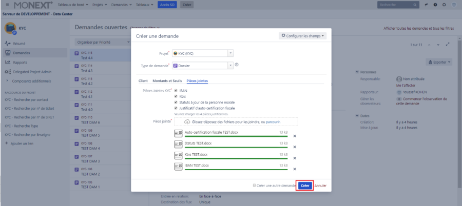 • Cliquer sur le bouton « Créer » en bas à droite de la fenêtre pour créer le ticket dans l'application.