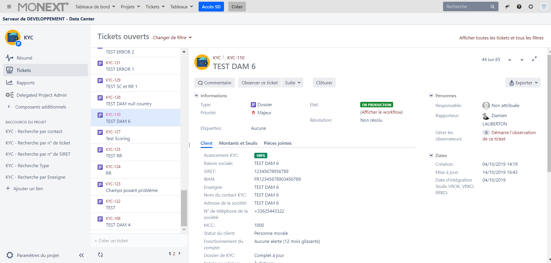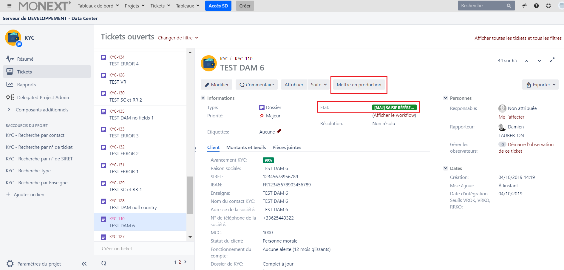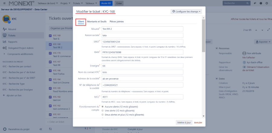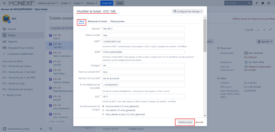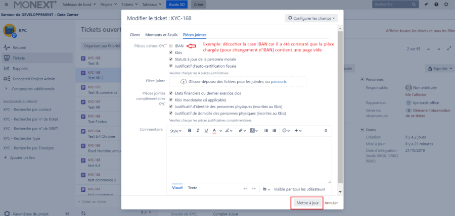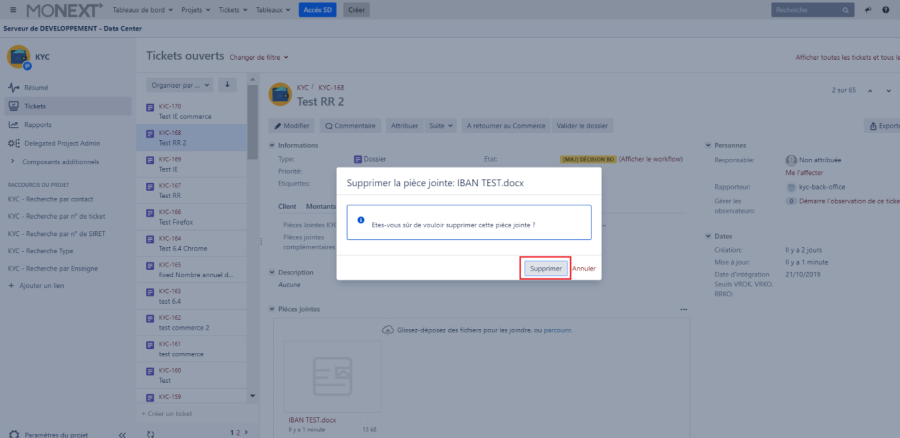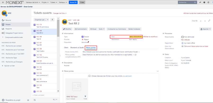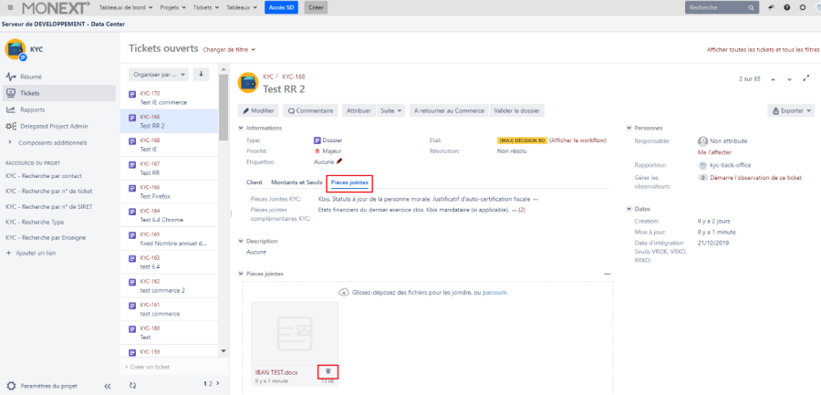 Dès le passage du ticket en production, toutes les pièces justificatives sont purgées de l'application KYC JIRA. Vérifier de bien avoir téléchargé les pièces justificatives avant de faire passer le ticket en production.