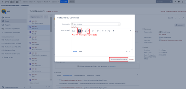 - Sélectionner le style Gras et la couleur Rouge de la police, et saisir les motifs de rejet pour explication au Commerce. Cliquer ensuite sur le bouton « A retourner au Commerce »