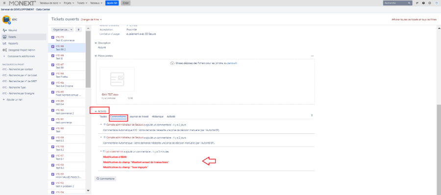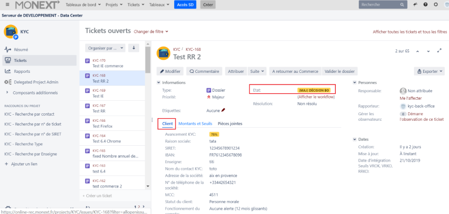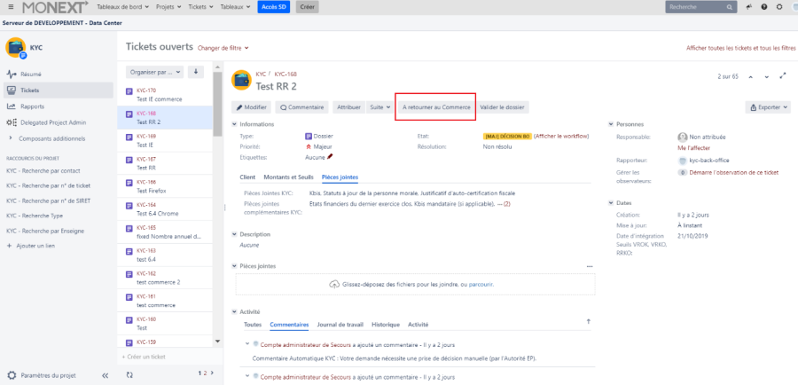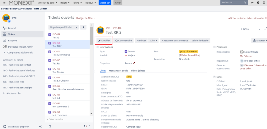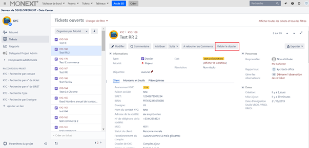 - Revenir sur l'application KYC JIRA, et sélectionner le ticket en cours de traitement.