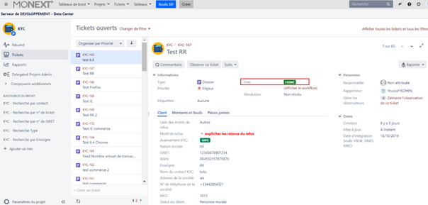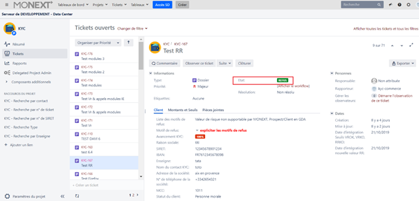 1. Ticket au statut "REFUS" : ce cas se présenterait lors d’un refus d’entrée en relation avec un prospect ou lors d’un refus du maintien de la relation d’affaire avec un client lors d’une mise à jour du ticket ;