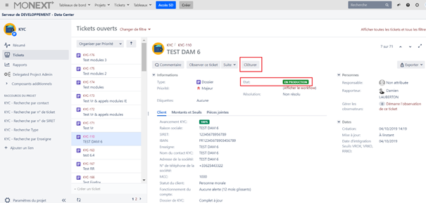 2. Ticket au statut "EN PRODUCTION" : ce cas se présenterait lors d’une rupture commerciale avec un client.