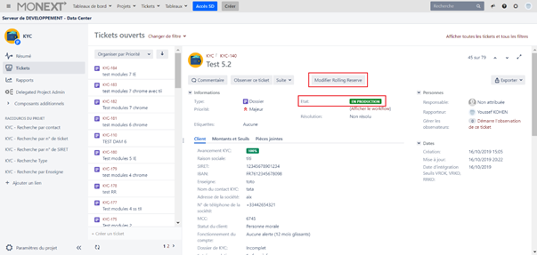 • Sélectionner le ticket pour lequel l’autorité EP souhaite modifier la Rolling Reserve. Celui-ci se trouve à l’état « EN PRODUCTION ».