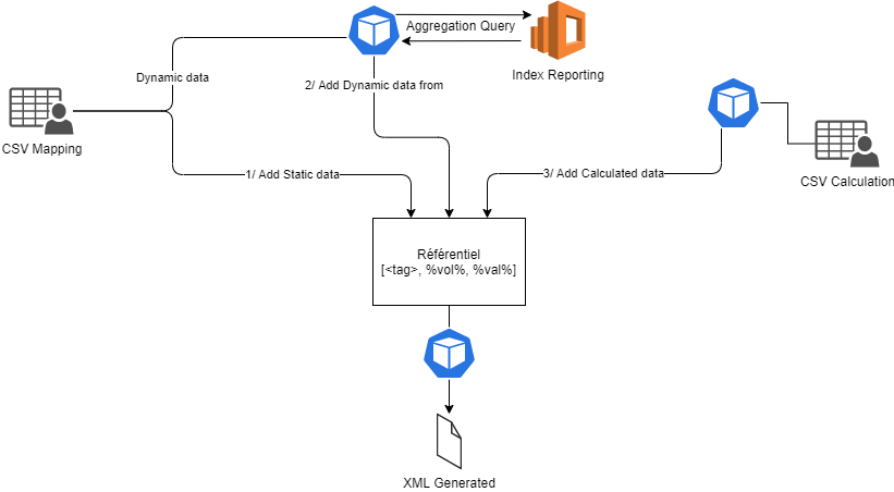 A partir du fichier XML d'origine fourni, l'étape 1 du script récupère le fichier CSV de mapping et pour chacun des tags remplace la valeur et le volume soit fourni directement dans la configuration, soit en exécutant la recherche sur l'index Transaction d'ElasticSearch.